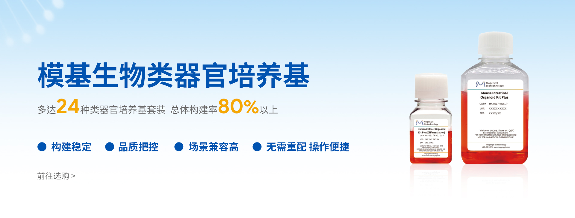 廈門(mén)模基生物科技有限公司致力于3D細(xì)胞培養(yǎng)核心原材料的研發(fā)與產(chǎn)業(yè)化升級(jí),是國(guó)內(nèi)一家從科研做起,從實(shí)驗(yàn)研究中一路走來(lái)的全流程自主研發(fā)、自主生產(chǎn)的企業(yè)。目前公司的產(chǎn)品有基質(zhì)膠、類(lèi)器官培養(yǎng)基、細(xì)胞因子、3D細(xì)胞培養(yǎng)耗材、3D細(xì)胞培養(yǎng)智能顯微鏡等。公司擁有4大技術(shù)研發(fā)中心:分子克隆和細(xì)胞編輯中心、實(shí)驗(yàn)動(dòng)物中心、蛋白表達(dá)和純化平臺(tái)、類(lèi)器官質(zhì)檢系統(tǒng)和自動(dòng)化。